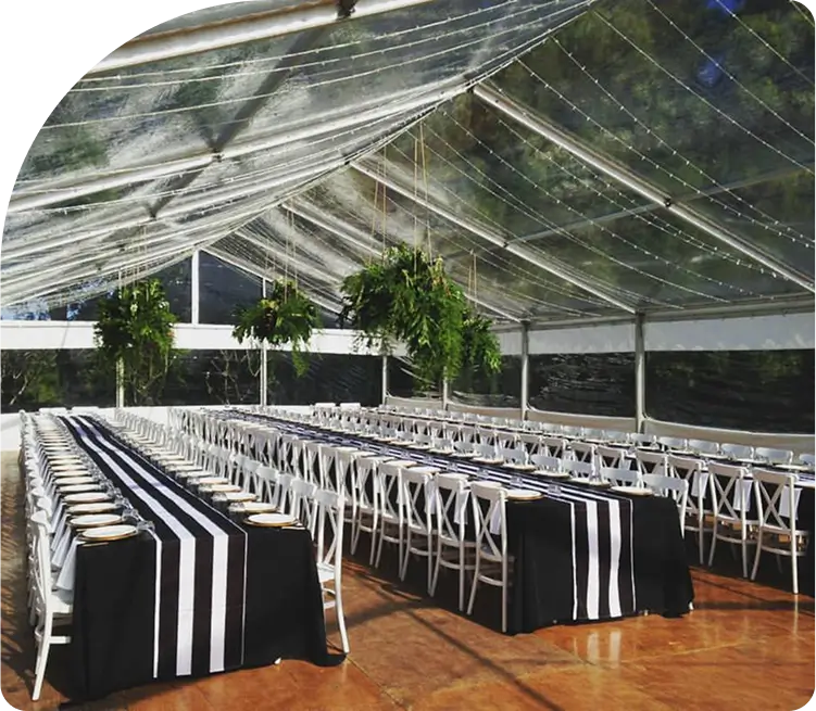 Choose sizes from 3m × 3m pop‑ups for merch tents through 6m × 12m clear‑roof hi‑tops ideal for cocktail weddings, up to our showpiece 10m × 27m white pavilion seating 250 guests. All hires include aluminium frame, guy ropes, half the walling (white or clear) and professional install Friday with pack‑down Monday.