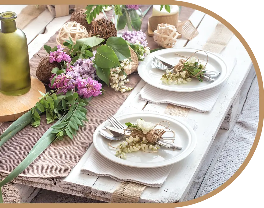 Linen and Tableware to Finish the Look Add the final touches with our range of crisp linens and complete your place settings with our classic or eco-friendly tableware.